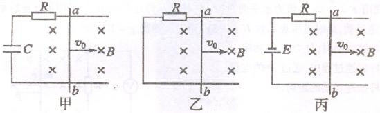 在图甲、乙、丙三图中,除导体棒ab可动外,其余部分均固定不动,甲图中的电容器C原来不带电.设导体棒、导轨和直流电源的电阻均可忽略,导体棒和导轨间的摩擦也不计,图中装置均在水平面内,且都处于方向垂直水平面(即纸面)向下的匀强磁场中,导轨足够长.今给导体棒ab一个向右的初速度u0 ,在甲、乙、丙三种情形下导体棒ab的最终运动状态是( )