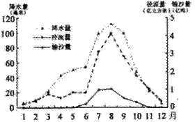 下图为“我国某河流中游水文观测站多年月平均降水量、径流量、输沙量变化图”。读图回答20-22题。
