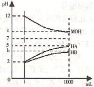 (7分)某化学学习小组为研究HA、HB和MOH的酸碱性的相对强弱,设计以下实验以下实验:将pH==2的两种酸溶液HA,HB和pH=12的MOH碱溶液各1mL,分别加水稀释到1000mL,其pH的变化与溶液体积的关系如图,根据所给的数据,请回答下列问题: