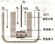 (3)随着对合成氨研究的发展,2001年两位希腊化学家提出了电解合成氨的方法,即在常压下吧氢气和用氦气稀释的氮气,分别通人一个加热到500℃的电解池中,采用高质子导电性的SCY陶瓷(能传递H+)为介质理用吸附在它内外表面上的金属但多晶薄膜像电噪,实现了常压、570℃条件下高转化率的电解法合成氮(装置如图)。