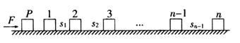 (18分)如图所示,在光滑的水平面上沿直线按不同的间距依次排列着质量均为m的滑块1、2、3、…、(n-1)、n,滑块P的质量也为m。P从静止开始在大小为F的水平恒力作用下向右运动,经时间T与滑块1碰撞,碰撞后滑块便粘连在一起,以后每经过的时间T就与下一滑块碰撞一次,每次碰撞后均粘连在一起,碰撞时间极短,每个滑块都可简化为质点,求: