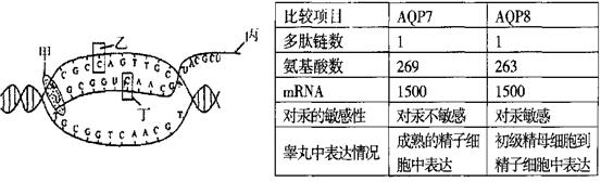 33、(10分)下图是大白鼠细胞内某生理过程示意图,下表是其曲细精管细胞中存在的两种水通道蛋白AQP7和AQP8的部分比较。请分析回答下列问题: