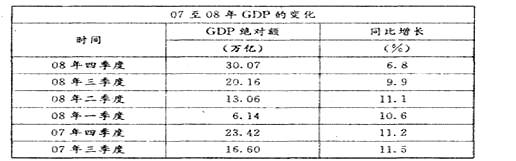 材料一 2007年第三季度一2008年第四季度我国GDP的变化情况图