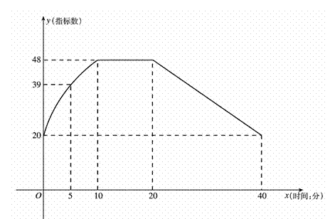 (本小题满分12分)通过实验研究,专家们发现:初中学生听课的注意力指标数是随着老师讲课时间的变化而变化的,讲课开始时,学生的兴趣激增,中间有一段时间,学生的兴趣保持平稳的状态,随后开始分散. 学生注意力指标数y随时间x(分钟)变化的函数图象如图所示(y越大表示学生注意力越集中).