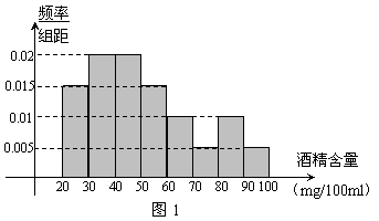 据《法制晚报》报道,2009年8月15日至8月28日,全国查处酒后驾车和醉酒驾车共28800人,如图1是对这28800人酒后驾车血液中酒精含量进行检测所得结果的频率分布直方图,则属于醉酒驾车的人数约为( C )