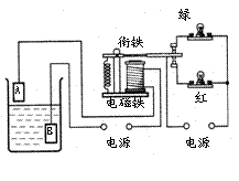 如图所示是一个水位自动报警器的原理图。水位没有到达金属块A时,绿灯亮;水位到达金