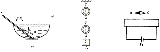 (1)如图甲所示,插入水中的筷子,在水中的部分看起来向上弯折,人眼在C点处看到筷子B点的像在位置B'点。请画出B点的一条光线经水面折射后过C点的光路图。