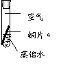 取6个试管,6个用砂纸打磨过的铜片。将6个铜片分别放在6个试管中,如图所示:1号铜片放在干燥的空气中,2号铜片放在盛有蒸馏水和氧气的试管中,3号铜片放在盛有蒸馏水和二氧化碳的试管中,4号铜片部分浸没在蒸馏水中,5号铜片部分浸没在盐水中,6号铜片部分浸没在稀硫酸中。把6个试管同时放在温度较高的地方。(为避免水分蒸发可都加上胶塞)