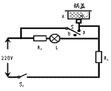 如图所示,是小明设计的一种饮水机简易原理图,A为水箱,L为指示灯,其电阻为10Ω,S1为电源开关,S为温控开关,有a、b两个触点。R1为加热电阻,下表是一些技术参数。(不考虑R1、R2和指示灯L的阻值受温度变化的影响,表中的功率均指R1的功率)