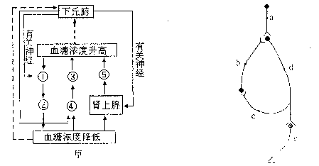 (2)下丘脑可通过有关神经的作用参与血糖的调节。若乙图为调节过程中部分结构示意图,则图中涉及 个神经元,这些细胞所处的内环境为 。已知图中细胞受到刺激后释放的化学递质均为兴奋性递质,若图中b处受到足够强度的刺激,则除b处以外,图中可能发生兴奋的部位有 (选填图中字母)
