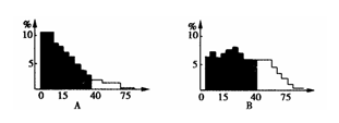 24.图8表示A、B两国人口的年龄组成图(设男女性别比例=1:1)。横轴表示年龄,纵轴表示各年龄段人口占总人口的百分比,下列叙述能反映人口数量变化规律的是 ( )