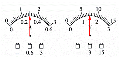 (2)实验中,电流表的量程应选 0-0.6 A,电压表的量程应选 0-3 V;某次实验中,若电流表的示数是O.3A,电压表的示数是l.5V,请根据你前面选择的量程,在图13中分别画出两表指针的位置。