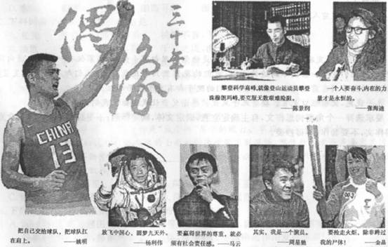 17.下面是《人民日报》的一则报道《青春偶像30年》的插图,请用简要的文字概括青春偶像内涵的变化,并对这一变化写一句评论。(4分)