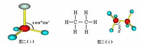 当甲烷分子中某氢原子被其他原子或原子团取代时,该代替原子的共面问题,可将它看作是原来氢原子位置。若将其中一个氢原子换成一个氯原子,由于C-H键键长短于C-Cl键长则以氯原子为顶点的正三棱锥如图二(1),同样这五个原子不能共面。同理将甲烷中的一个氢原子换为甲基,则变为乙烷如图二(2)所示: