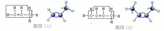 若将其中的氢原子换成氯原子,其与所有碳氢原子共面。若将一个氢原子换成甲基,即为丙烯则如图四(1):将两个氢原子换成甲基则为2-丁烯如图四(2)