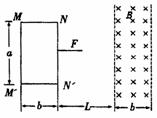 (15分)如图所示,在光滑水平桌面上有一个长为a、宽为b的矩形金属框MNNˊMˊ,金属框的质量为m、电阻为R.在距离金属框NNˊ边的L处有竖直方向的匀强磁场,磁场的宽度为b,其边界平行于NNˊ,现用垂直于NNˊ的水平恒力F向右拉动线框,使之从静止开始向右运动,恰能匀速通过磁场区域.求: