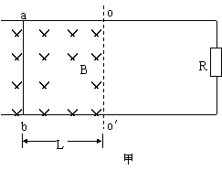 4.如图甲所示,相距为L的光滑平行金属导轨水平放置,导轨一部分处在以OO′为右边界的匀强磁场中,匀强磁场的磁感应强度大小为B,方向垂直导轨平面向下,导轨右侧接有定值电阻R,导轨电阻忽略不计,在距边界OO′也为L的初始位置处,垂直导轨旋转一质量为m、电阻为r的金属杆