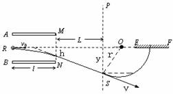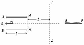 4.(18分)如图所示,两平行金属板A、B长l=8cm,两板间距离d=8cm,A板比B板电势高300V,即UAB=300V。一带正电的粒子电量q=10-10C,质量m=10-20kg,从R点沿电场中心线垂直电场线飞入电场,初速度v0=2×106m/s,粒子飞出平行板电场后经过界面MN、PS间的无电场区域后,进入匀强磁场区域,磁场方向垂直纸面向里。已知两界面MN、PS相距为L=12cm,粒子穿过界面PS最后垂直打在放置于中心线上的荧光屏EF上。求(静电力常数k=9×109N·m2/C2)