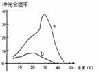 马铃薯净光合速率(光合速率-呼吸速率)与温度、CO2浓度的关系如右图所示,a 曲线对应CO2浓度为1.22%,b 曲线对应CO2浓度为0.03%。正确的说法是