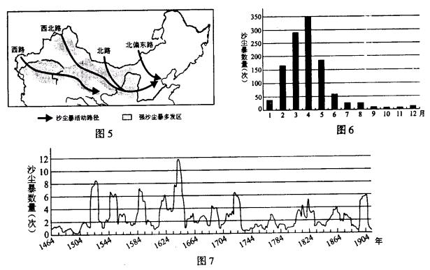 35.沙尘暴是指强风从地面卷起大量沙尘,使大气水平能见度小于1千米的特殊天气现象。图5示意我国沙尘暴主要活动路径和强沙尘暴多发区;图6、图7依次表示1464-1913年华北地区沙尘暴按月份累计次数和逐年统计次数。分析图5、图6、图7,回答下列问题。(20分)