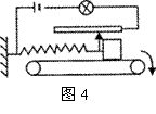 21.如图4所示,水平的传送带上放一物体,物体下表面及传送带上表面均粗糙,导电性能良好的弹簧右端与物体及滑动变阻器滑片相连,弹簧左端固定在墙壁上,不计滑片与滑动变阻器线圈间摩擦。当传送带如箭头方向运动且速度为v时,物体与传送带发生相对滑动,当传送带逐渐加速到2v时,物体受到的摩擦力和灯泡的亮度将