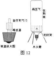 “神州七号”发射成功后,同学们对火箭升空的原理非常感兴趣。他们选用如下器材:饮料瓶、气筒、自行车气门、铁丝、橡皮塞、水等进行实验。火箭构造如图12所示,实验过程如下:在瓶中装适量的水,塞好瓶塞后放在发射架上.用气筒向瓶内打气,瓶内上方气体压强达到一定程度,高压气体将水和橡皮塞从瓶口压出,高速喷出的水流射向地面的同时,也把饮料瓶推向空中。水火箭升空原理可利用我们所学过的______________知识来解释。从能量转化角度来看,水火箭上升过程中是_______能转化为 能。