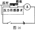 测量体重的电子秤,其测量部分的原理如图16中的虚线框所示,它主要由压力传感器R(电阻值会随所受压力的大小而发生变化的可变电阻),显示体重大小的仪表A(实质上是电流表)组成。压力传感器表面能承受的最大压强为l×107Pa,且已知压力传感器R的电阻值与所受压力的关系如下表所示。设踏板和压杆的质量忽略不计,接通电源后,压力传感器两端的电压恒为4.8V,取g=10N/kg。请通过计算回答: