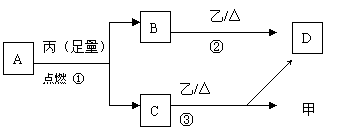 32、(6分)A是只含有x、y元素的气体,甲、乙分别是x、y元素的单质,丙是z元素的单质。且X、y、z均为短周期元素,含y元素的物质绝大多数都是有机物。甲、乙、丙和A、B、C、D有如下所示的转化关系: