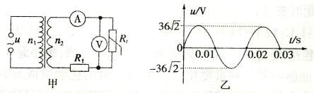 A.大小为零 B.方向水平向右 C.方向水平向左 D.大小和方向无法判断 17.如图甲所示,理想变压器原线圈接图乙所示的正弦交流电,副线圈与理想电压表、理想电流表、热敏电阻Rt(阻值随温度的升高而减小)及定值电阻R1组成闭合电路。则以下判断正确的是