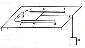 如图所示,相距为l 的光滑平行金属导轨ab 、cd 放置在水平桌面上,阻值为R 的电阻与导轨的两端a 、c相连。滑杆MN质量为m ,垂直于导轨并可在导轨上自由滑动,不计导轨、滑杆以及导线的电阻。整个装置放于竖直方向的范围足够大的匀强磁场中,磁感应强度的大小为B 。滑杆的中点系一不可伸长的轻绳,绳绕过固定在桌边的光滑轻滑轮后,与另一质量也为m 的物块相连,绳处于拉直状态。现将物块由静止释放,当物块达到最大速度时,物块的下落高度