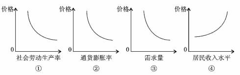 26.下列示意图反映的是通常情况下价格与相关因素的关系。其中①②④分别反映的是价格随社会劳动生产率、通货膨胀率、居民收入水平变化的曲线,③反映的是需求量随价格变化的曲线。这些示意图中正确反映价格与相关因素关系的是