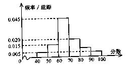 分成6组:第一组,成绩大于等于40分且小于50分;第二组,成绩大于等于50分且小于60分;……第六组,成绩大于等于90分且小于等于100分,据此绘制了如图所示的频率分布直方图。