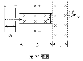 35.一带正电的粒子带电量为q,质量为m。从静止开始经一电压U1=100V的匀强电场加速后,垂直进入一电压U2=40V的平行板电场,平行板长L=0.2m,间距d=1cm。在平行板区域同时存在一垂直纸面向里的匀强磁场,磁感应强度B1=1T。粒子穿过平行板后进入另一垂直向里的有界匀强磁场区域,磁感应强度为B2,宽度D=0.1m。最后从此磁场的右边界以60°穿出(如图所示)。已知粒子的比荷为