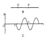 如图甲所示,O点为振源,OP = s,t = 0时刻,O点由平衡位置开始向下运动,产生沿直线OP向右传播的简谐横波.如图乙为P点的振动图象(从t1时刻开始振动).则以下说法中正确的是