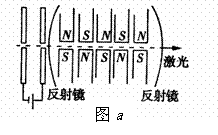 (20分)常见的激光器有固体激光器和气体激光器,世界上一些发达国家已经研究出了自由电子激光器,其原理的简单示意如图(a)所示.自由电子(设初速度为零,不计重力)经电场加速后,射入上下排列着许多磁铁的管中,相邻的两块磁铁的极性是相反的,在磁场的作用下电子扭动着前进,犹如小虫在水中游动.电子每扭动一次就会发出一个光子(不计电子发出光子后能量的损失),管两端的反射镜使光子来回反射,结果从透光的一端发射出激光.若加速电场电压U=1.8×104