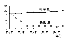 食池中的无脊椎动物和藻类。生态学家在上述潮间池进行实验,将部分潮间池的海星全部移除,其它潮间池的海星保留作为对照,进行连续十年的调查,并记录潮间池内物种数变化,结果如图所示。根据上述实验,下列推论正确的是