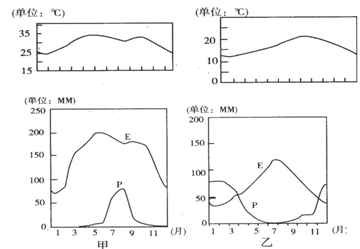 (1)从两地气温与降水分析,甲.乙两地的气候类型分别是甲______________,乙____________。(4分)
