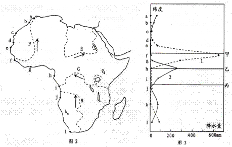 材料2:图2中a一i表示非洲西海岸地带的城市。图3中折线1、2表示这些城市1月、7月的降水量分布,甲、乙和丙中的某一条直线表示赤道。据此回答(4)-(7)。