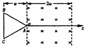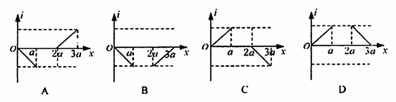 如图所示,两条平行虚线之间存在方向垂直纸面向里的均强磁场,虚线间的距离为2a。一高为a的正三角形导线圈ABC从图示位置沿x轴正方向匀速穿过磁场区域,取顺时针方向为电流的正方向,在表示线圈中产生的感应电流i与线圈移动距离x关系的下列图像中,正确的是