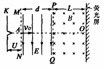 如图所示,K与虚线MN之间是加速电场,虚线MN与PQ之间是匀强电场,虚线PQ与荧光屏之间是匀强磁场,且MN、PQ与荧光屏三者相互平行,电场和磁场方向如图所示,图中A点与 O点的连线垂直于荧光屏。一带正电的点电荷由静止开始经加速电场加速后,从A点离开,垂直射入偏转电场,在离开偏转电场后进入匀强电场,最后恰好垂直地打在图中的荧光屏上。已知偏转电场和偏转磁场区域在竖直方向足够长,加速电压U与偏转电场的场强E的关系为U=