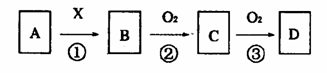 A﹑B﹑C﹑D﹑X均是中学化学常见的短周期元素组成物质,且反应①﹑②﹑③在中学化学中也是常见反应,其转化关系如下图所示,图中其他产物及反应条件已略去。