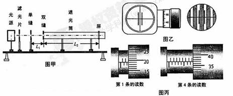 (a)分划板的中心刻线分别对准第1条和第4条亮纹的中心时,手轮上的读数如图丙所示,则对准第1条时的读数x1= mm,对准第4条时的读数x2= mm;