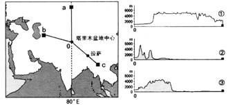 下图为以塔里木盆地某点(O)为中心向a、b、c三个方向绘制的地形剖面图。据此回答4-5题。
