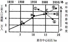 下图为某城市钢铁工业区位的变化。A、B、C为随着时间的推移该工业三次迁移的状况;①②③