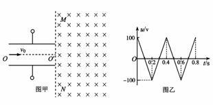 24.(22分)如图甲,两平行金属板间接有如图乙所示的随时间t变化的交流电压u,金属板间电场可看做均匀、且两板外无电场,板长L=0.2m,板间距离d=0.1m,在金属板右侧有一边界为MN的区域足够大的匀强磁场,MN与两板中线OO′ 垂直,磁感应强度 B=5×10-3T,方向垂直纸面向里。现有带正电的粒子流沿两板中线OO′连续射入电场中,已知每个粒子的速度v0=105m/s,比荷