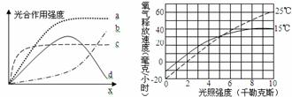 ⑴如果x代表光照强度,光照强度影响光合作用强度,主要是影响 阶段,当光合作用强度达到最大值时,此时限制因素最可能是内部因素中的 。