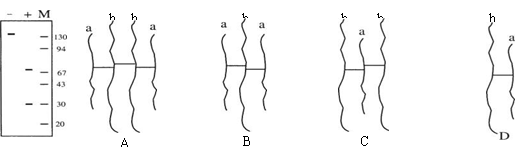 5.细菌蛋白质在极端环境条件下可通过肽链之间的二硫键维持稳定。已知不同的多肽产物可因分子量不同而以电泳方式分离。下列左图是一个分析细菌蛋白的电泳结果图,“-”代表没加还原剂,“+”代表加有还原剂,还原剂可打断二硫键,“M”代表已知分子量的蛋白质,右侧数字代表蛋白质或多肽的相对分子量。根据左侧结果,下列哪个图案最能代表该细菌原本的多肽结构(注意:“一”代表二硫键)
