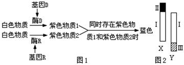 Ⅱ:某自然种群的雌雄异株植物为XY型性别决定,该植物的花色(白色、蓝色和紫色)由常染色体上的两对独立遗传的等位基因(D、d 和R、r)控制,叶形(宽叶和窄叶)由另一对等位基因(H和h)控制,请据图分析回答:[注:图1为该植物的花色控制过程。图2为该植物的性染色体简图,同源部分(图中的I片段)基因互为等位,非同源部分(图中的II、III片段)基因不互为等位。]