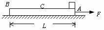 (19分)如图所示,光滑水平面上放置一长木板,其质量为2 m,长为L,C点为上表面的中点,木板右端(A点)有一块静止的质量为m的小金属块。金属块与木板的上表面之间存在摩擦,已知金属块与AC段间的动摩擦因数为μ。现给木板一个向右的水平恒力F=5μmg,使木板向右运动,同时金属块在木板上开始运动,当金属块滑到中点C时,立即撤去这个水平恒力F,最后金属块恰停在木板的左端(B点)。已知重力加速度为g,求: