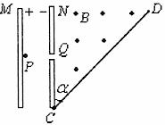 (21分)如图所示,M、N为两块带等量异种电荷的平行金属板,两板间电压可取从0到某一最大值之间的各种数值。静止的带电粒子带电量为+q,质量为m(不计重力),从点P经电场加速后,从小孔Q进入N板右侧的匀强磁场区域,磁感应强度大小为B,方向垂直纸面向外,CD为磁场边界上的一绝缘板,它与N板的夹角为α=45°,孔Q到板的下端C的距离为L。当M、N两板间电压取最大值时,粒子恰垂直打在CD板上。求